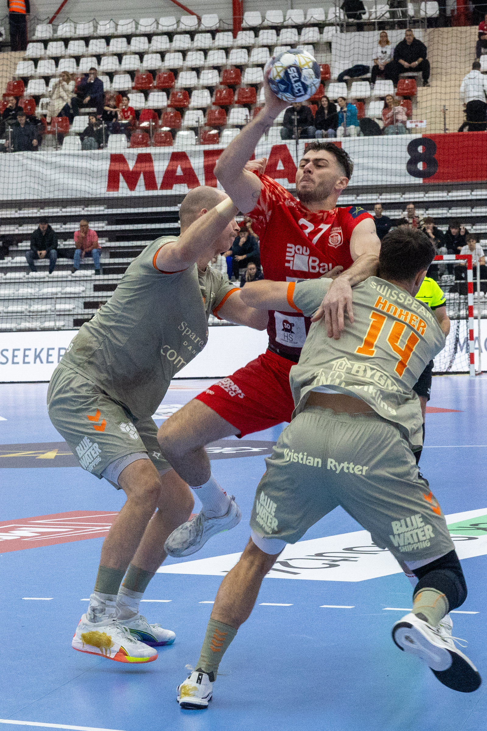 Da Simon Hald kort efter modtog en 2-minutters udvisning, steg sværhedsgraden yderligere. Hoxers første mål blev hurtigt modsvaret med scoring fra Tom Pelayo og med 10 minutter igen var stillingen 24-25.