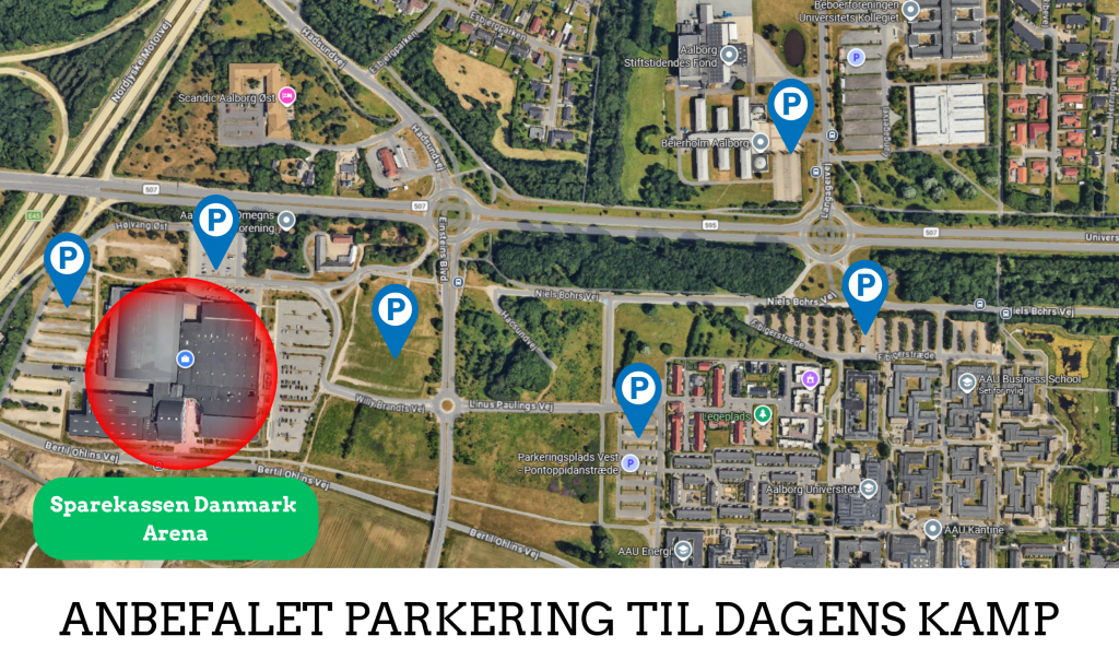 Parkeringsområder ved Sparekassen Danmark Arena, samt ved pendlerpladsen ved motorvejsafkørslen ved Gigantium er tilgængelige – se nærmere i videoen herunder.