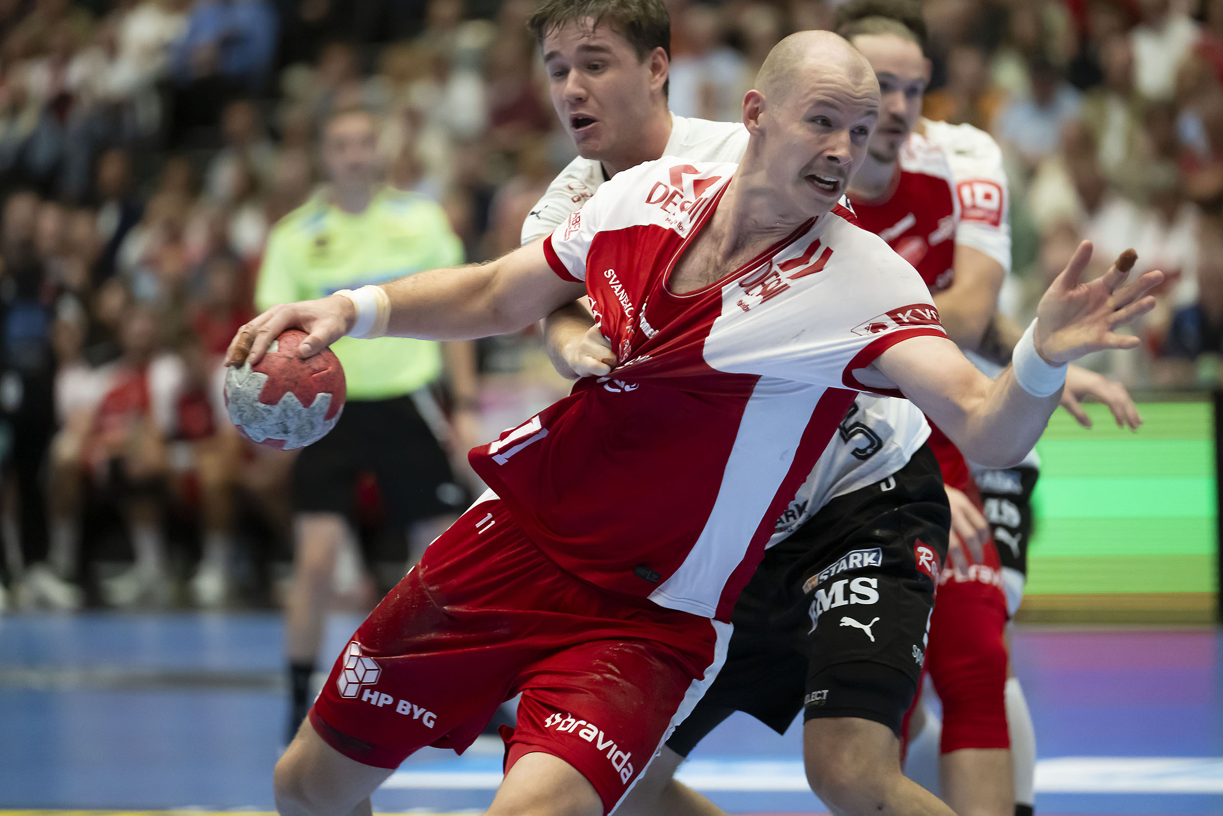 Sekunder efter var der spilstop og dramatik, da Patrick Helland Anderson blev tacklet uregelmæssigt på et skudforsøg, hvilket gav VAR-tjek af dommerduoen og efterfølgende direkte rødt kort til TTH Holstebros anfører Mathias Smed.